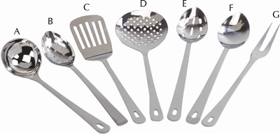 DESCRIPTION: Sober Spoons Length : 33 cm (A)Laddle (B) Pan Perforated (C) Turner Slotted (D) Skimmer (E) Pan Slotted (F) Pan Solid (G) Fork